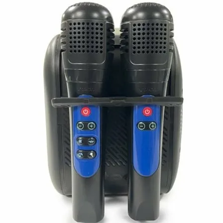 - Dos micrófonos para cantar a dúo, con 4 botones con efecto vibrato, efecto que simula coros y efectos para modificar la voz.
