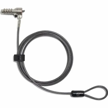 - Notas técnicas: Longitud del cable: 1,83 m (6 pies) Diámetro del cable: conjunto de acero de 3,2 mm envuelto en tubo de PVC de 4,4 mm Tipo de bloqueo: combinación de cuatro dígitos preconfigurada Material: aleación de zinc para estructura y cabezal de bloqueo, cable de acero galvanizado Ranura de bloqueo compatible: Cabezal giratorio HP Nano: 360 grados para el cabezal y el propio cable de bloqueo; 90 grados para el ángulo del cable