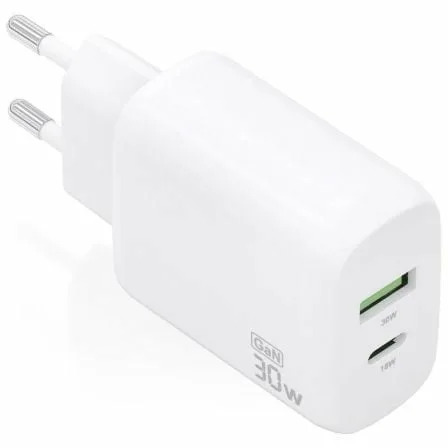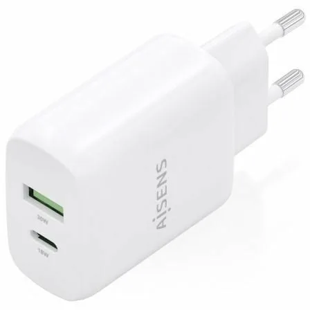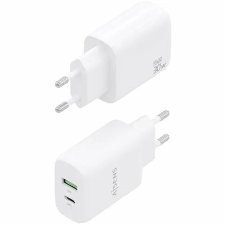AISENS – CARGADOR GaN 30W, 1xUSB-C PD3.0 QC4.0, 1xUSB-A QC3.0, BLANCO