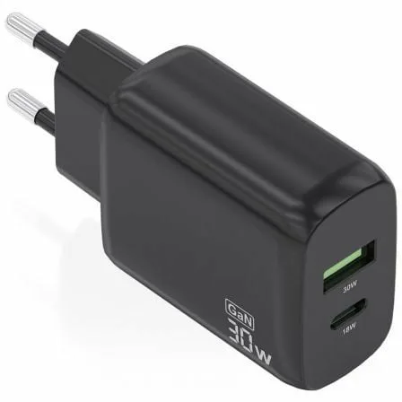 AISENS – CARGADOR GaN 30W, 1xUSB-C PD3.0 QC4.0, 1xUSB-A QC3.0, NEGRO
