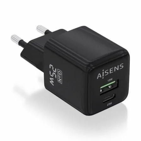 Cargador de Pared GaN Aisens ASCH-25W2P015-BK/ 1xUSB Tipo-C/ 1xUSB/ 25W