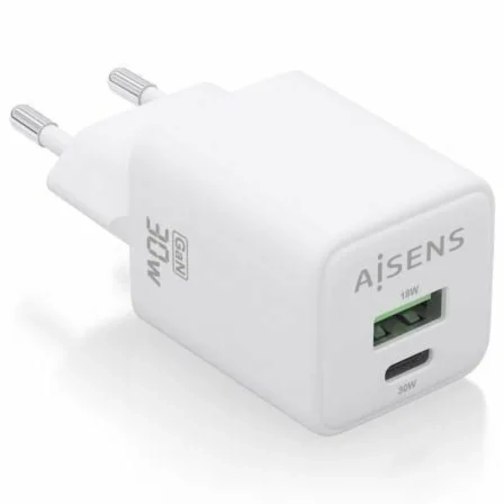 AISENS – CARGADOR GaN 30W, 1xUSB-C PD3.0 QC4.0, 1xUSB-A QC3.0, BLANCO