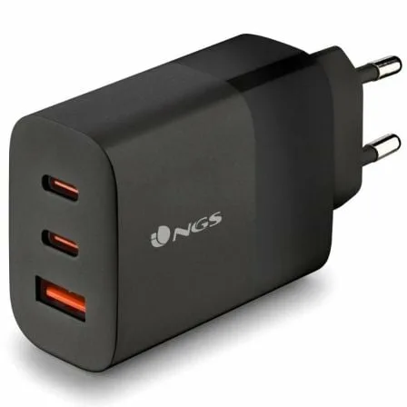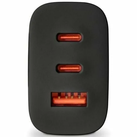 - Cargador de pared con 2 salidas USB-C (PD & PPS) y una salida USB-A QC 3.0 de 65W de potencia máxima para cargar dispositivos de manera rápida y eficiente.