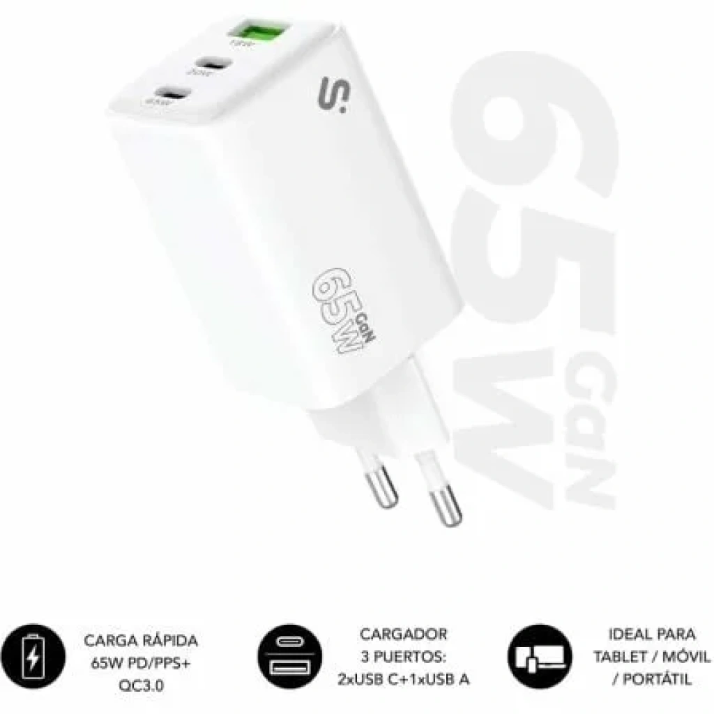 Cargador GaN 65 W SUBBLIM, 2 × USB-C + USB-A PD 3.0 & PPS, 45 W + 20 W simultáneos para MacBook Air/Pro