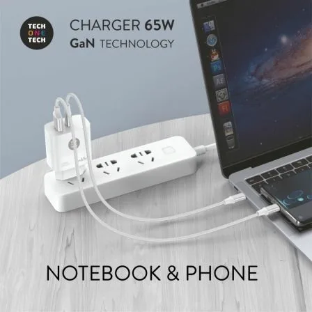 Gracias a sus 2 puertos USB-C y USB-A puedes cargar cualquier dispositivo del mercado (incluido disp. Apple MacBook / Iphone) que tenga un cable compatible para conectar a este cargador, que se adaptará a la tensión de tu dispositivo de forma inteligente. 2 salidas : USB-C 65W y USB-A 18W.