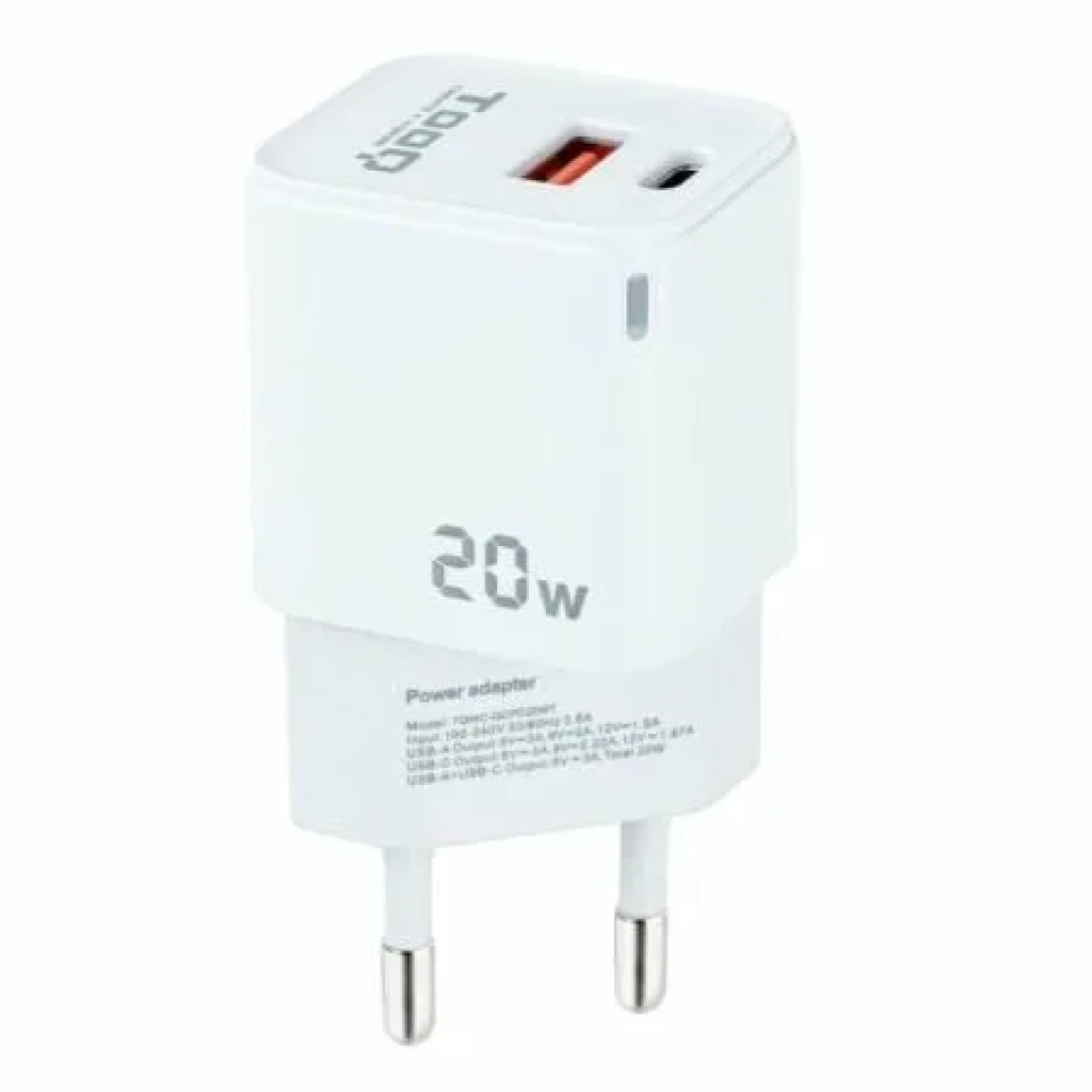 Cargador de Pared USB-C/PD + USB-A/QC 20W, Blanco