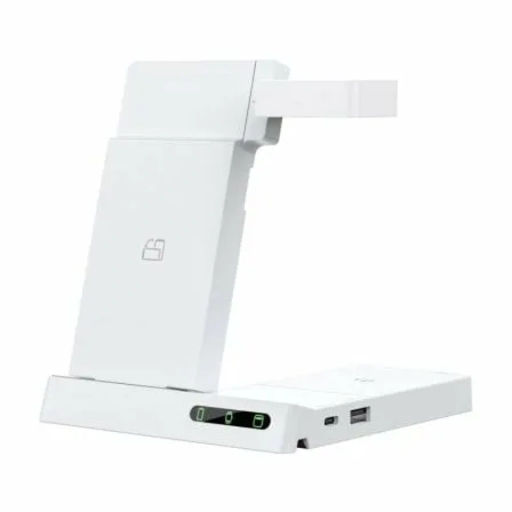 Este stand es perfecto, para mantener un orden en un zona de trabajo. ‘Las diferentes secciones son plegables y móviles dependiendo de que ‘quieras cargar, e incluso se puede usar sin la forma de stand. Puedes ‘cargar tu smartphone de forma inalámbrica en posición horizontal o ‘reclinado en el stand para seguir usándolo mientras se carga. Con los ‘auriculares y relojes inalámbricos, puedes cargarlos de forma cómoda y ‘segura y tenerlo todo organizado en un mismo sitio. Además al volverlo a’ su posición original se puede guardar de forma cómoda y que no estorbe ‘en el escritorio.