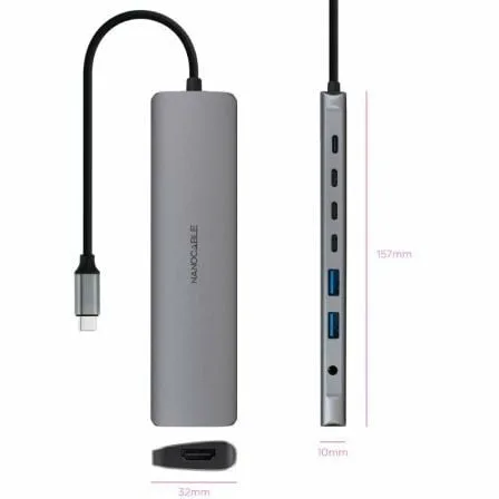 USB-C 8 en 1, USB-C 3.1 a 2 USB-A 3.0 + 3 USB-C 3.0 + USB-C PD + HDMI 4K a 60 Hz + conector de audio de 3,5 mm, aluminio, gris, 18 cm