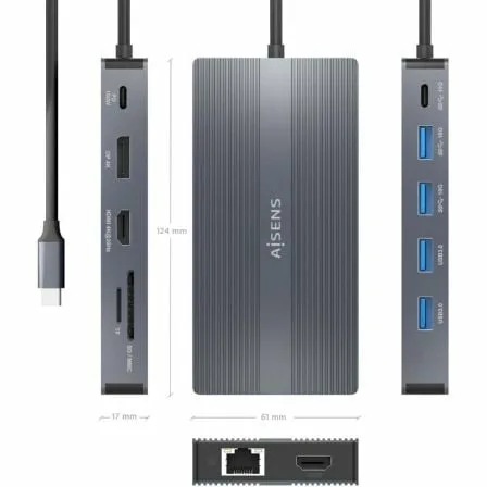 AISENS – USB-C DOCK 12 EN 1, USB-C A 2xHDMI, 1xDISPLAYPORT, 1xRJ45, 4xUSB-A, 1xUSB-C, 1xUSB-C PD, 1xSD, 1xMICRO SD, GRIS, 20CM