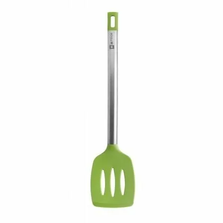 Es una espátula ideal para utilizar con tus sartenes, ollas, cazos o cacerolas, sin dañar su interior. Su silicona de alta calidad te ayuda a mover los alimentos sin rayar y su anchura es perfecta para poder recogerlos de la sartén y servirlos en el plato con total comodidad y pudiéndolos escurrir a la perfección, gracias a las ranuras que evitan la acumulación de aceite o líquidos en la espátula. Es además perfecta tanto para dar la vuelta a las piezas delicadas, como unos lomos o rodajas de pescado a la plancha o las verduras que quieras asar en el horno, como para remover lo que estás cocinando, incluso las patatas que fríes para tu tortilla. Sin dañar los alimentos y manteniendo tu batería de cocina como el primer día.