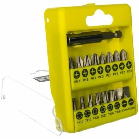 - Puntas de atornillar de 16 x 25 mm (1 x PH1, 2 x PH2, 1 x PH3, 1 x’ PZ1, 2 x PH2, 1 x PH3, 1 x TX10, 1 x TX15, 1 x TX20, 1 x TX25, 1 x ‘TX30, 1 x SL5, 1 x SL5), 1 x Soporte de broca de 60 mm