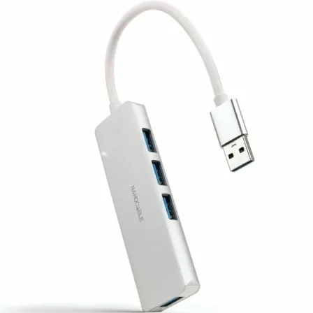 - Hub USB-A 3.0 con 4 puertos USB-A 3.0, con conector USB 3.0 Tipo A macho en un extremo y 4 puertos USB 3.0 Tipo A hembra en el otro.