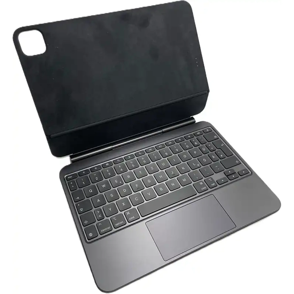 - El Magic Keyboard para el iPad Pro con trackpad integrado es ‘comodísimo para escribir. Además, tiene un nuevo diseño fino y compacto ‘con reposamuñecas en aluminio. Incluye 14 teclas de función que te dan ‘acceso directo a funciones como el brillo de la pantalla o los controles’ del volumen, y un conector USB‑C de carga simultánea. Su diseño con ‘apoyo flotante te permite ajustar el ángulo de la pantalla como ‘prefieras.