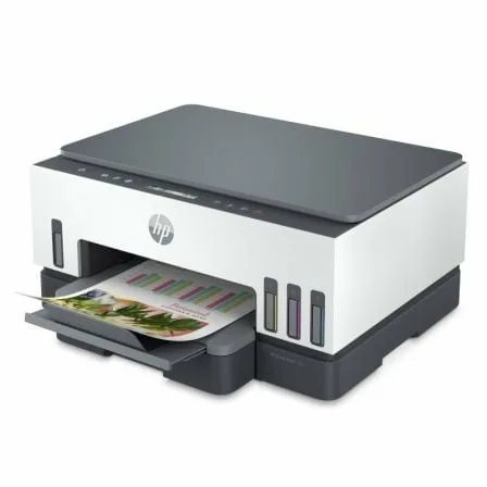 La HP Smart Tank 7005 es una impresora multifunción de inyección térmica de tinta a color, diseñada para hogares y pequeñas oficinas que requieren impresión de alto volumen a bajo coste. Ofrece funciones de impresión, copia y escaneo, con conectividad Wi-Fi de doble banda, Bluetooth y USB. Su sistema de tanque de tinta recargable permite imprimir hasta 12.000 páginas en negro o 8.000 en color con las botellas incluidas. Además, cuenta con impresión automática a doble cara y una pantalla LCD de 2 líneas para facilitar su uso.