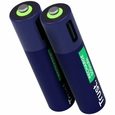 Las Trust USB-C Rechargeable AAA Batteries 2P son pilas recargables AAA que se cargan fácilmente mediante un cable USB-C. Ofrecen una solución práctica y sostenible, ideales para reemplazar cientos de pilas desechables con hasta 800 recargas. Incorporan indicadores LED para mostrar el estado de carga.