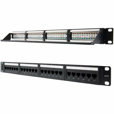 - 1 x Panel de parcheo de 24 puertos rj45 cat.6 utp, 19′ 1u dual idc, negro