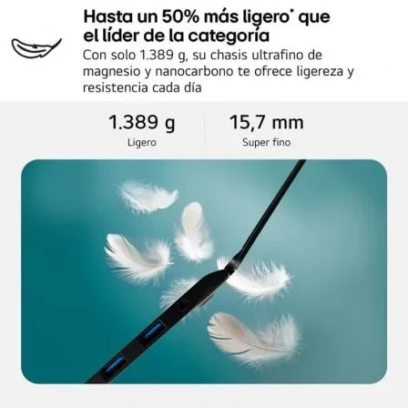 - Con solo 1,4 kg de peso, hasta 24,5 h y 16 mm de grosor, el LG gram te acompaña a donde quieras, combinando ligereza y autonomía para una libertad sin límites.