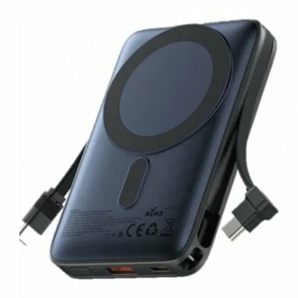 Batería externa magnética de 10,000 mAh (USB-C + USB-C/USB-A/Inalámbrico) con cable incorporado y soporte. Potencia de salida: 22.5 W ‘Pantalla LED blanca ‘Material: ABS con recubrimiento UV ‘Soporte de aleación de aluminio
