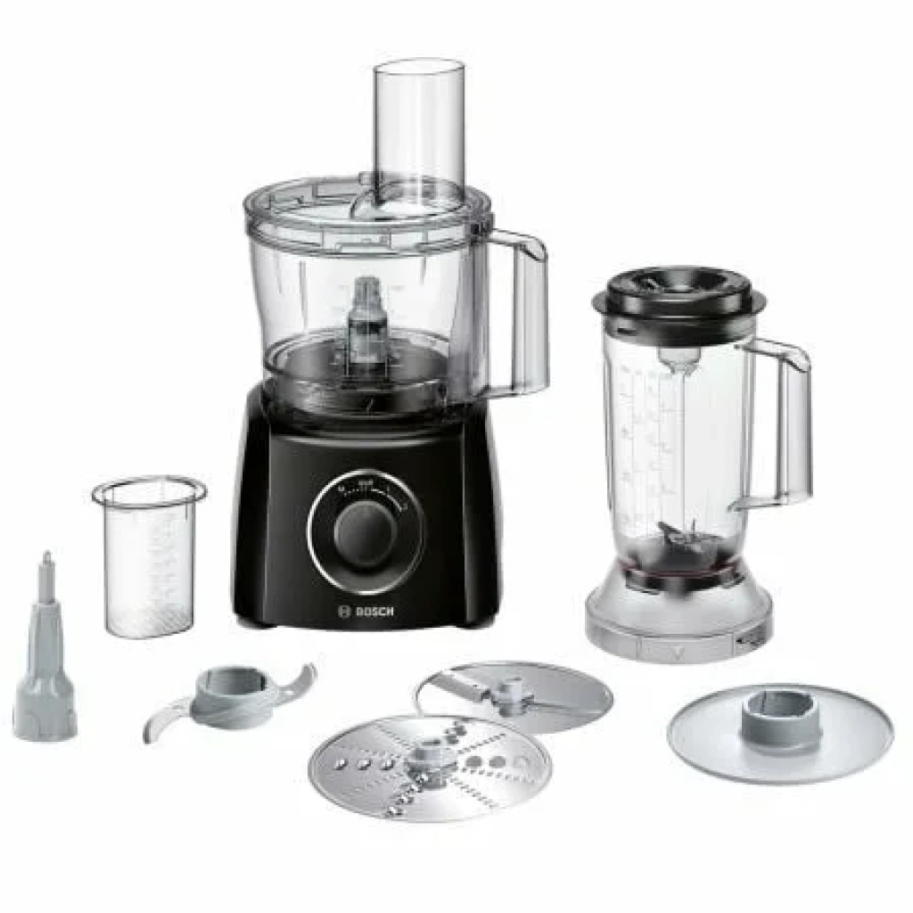- 1 x Tapa, 1 x Recipiente mezclador de plástico 500g, 1 x Jarra mezcladora de plástico, 1 x Disco rallador reversible, 1 x Disco mezcladora, 1 x Disco cortador reversible, 1 x Empujador, 1 x Cuchilla universal, 1 x Soporte para accesorios