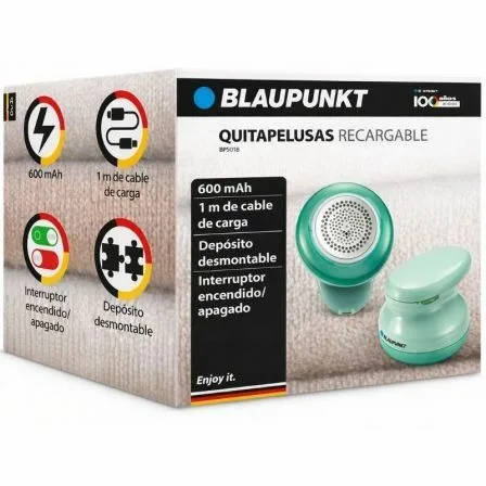 Blaupunkt BP5018 es un quitapelusas recargable para ropa y tapicerías’con depósito desmontable, tapa protectora, interruptor ON/OFF y’puerto de carga USB. Funciona con batería Ni-MH de 2,4 V (2×600’mAh) e incluye cable de carga de 1 m para un uso cómodo y continuo’en el hogar.