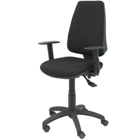 Silla de oficina Elche con mecanismo Asincro tapizada con Tela color Negro. Equipada con Base poliamida negra, Brazos 1D y Ruedas de nailon 50 mm