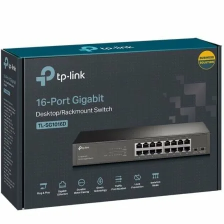 - Contenido del Paquete: Switch para sobremesa/bastidor con 16 puertos Gigabit