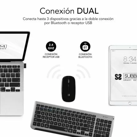 • El Teclado Inalámbrico Subblim soporta 3 dispositivos mediante dos canales con tecnología inalámbrica Bluetooth 5.2 y uno a través de un receptor USB RF 2.4G
