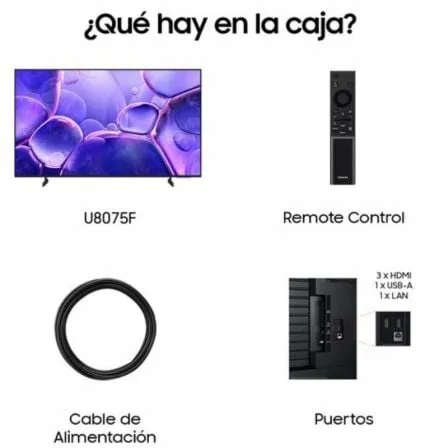 - Funciones Smart TV: Samsung TV Plus, SmartThings, Navegador web, Mobile to TV, Sound Mirroring, Wireless TV On, Daily+, Storage Share, Click to Search, Universal Guide